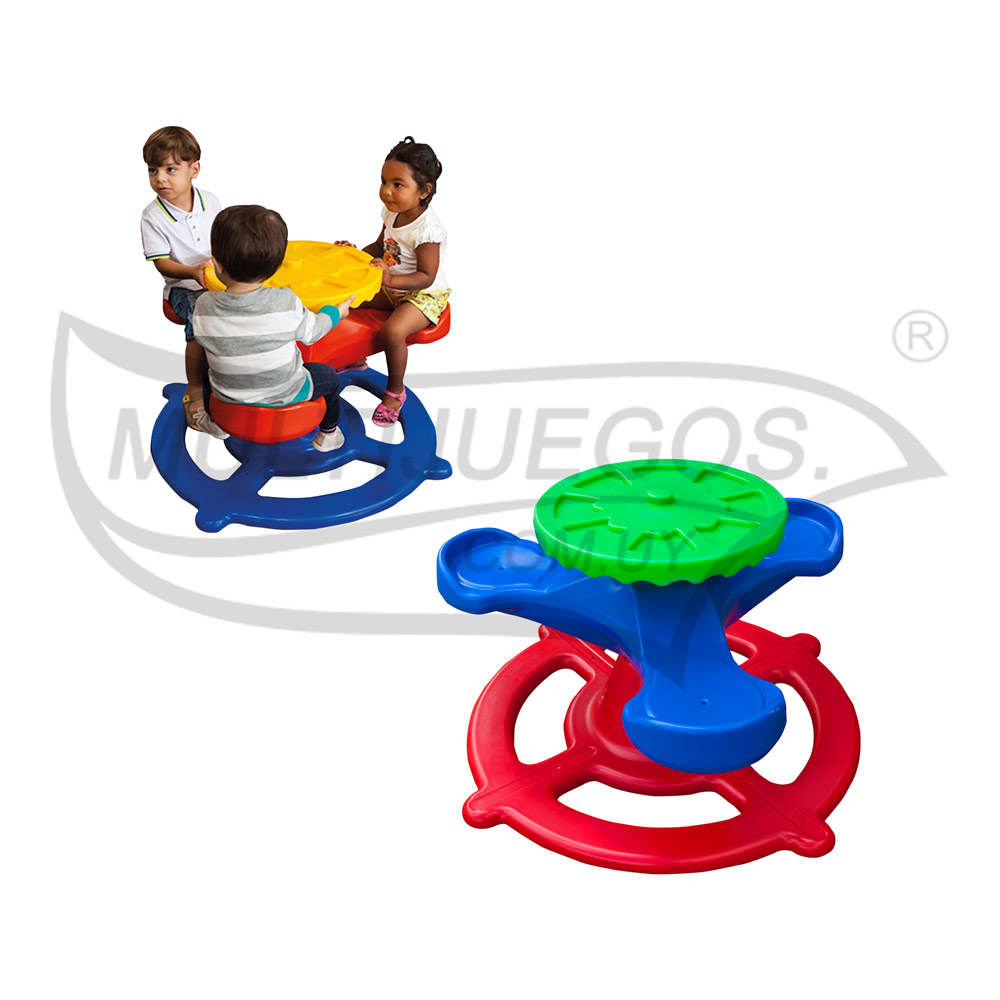 3 asientos individuales suspendidos, para que 3 niños puedan jugar al mismo tiempo.rnConcepto del antiguo plato giratorio de metal (calesita) fabricado en plástico ROTOMOLDEADO. Estructura metálica interna (no visible) para dar mayor resistencia al producto.rnEl juguete soporta hasta 25 kg en cada asiento, sin deformaciones. / Medidas: 100 × 55 cm