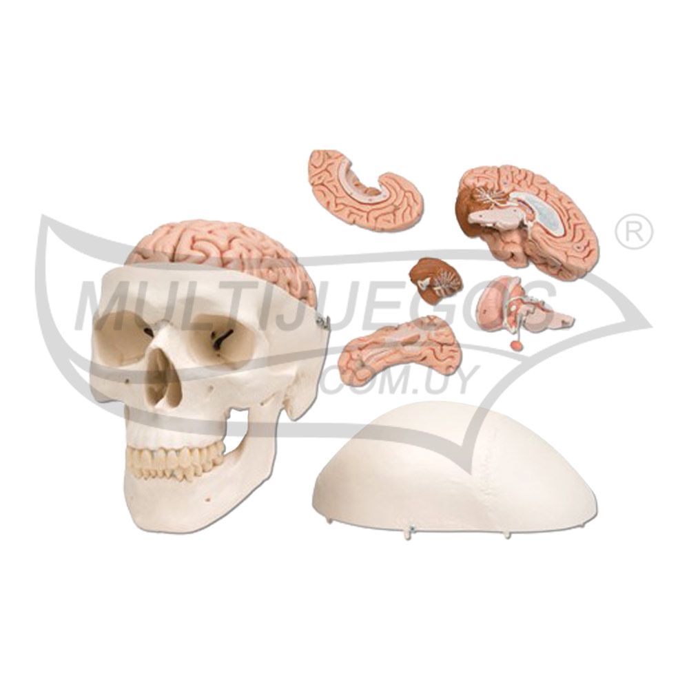 Cráneo con movimiento en mandíbula / Cantidad de piezas: 8 / Medidas: 23 x 17 x 15 cm / Material: cráneo en plástico y cerebro en goma / Embalaje: Caja / Dimensión del embalaje: / Características: Se divide en 8 partes diferentes