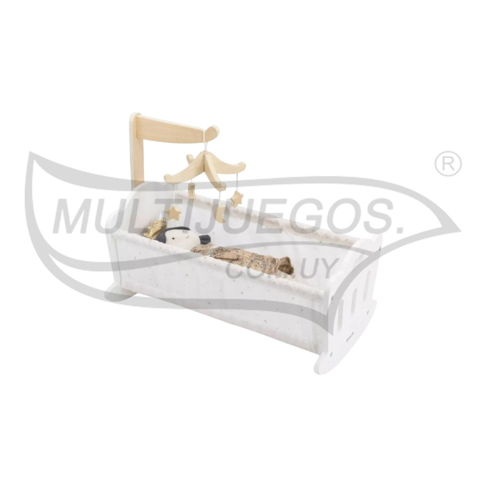 Incluye una almohada y colcha, con estampados de estrellas y lunas, y un carrusel de cuna en madera con estrellas y lunas. Apto para muñecas de hasta 38 cm