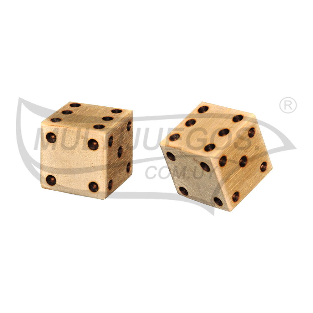 Se trata de un dado de madera de tono natural en el que las cifras se indican por medio de puntos.