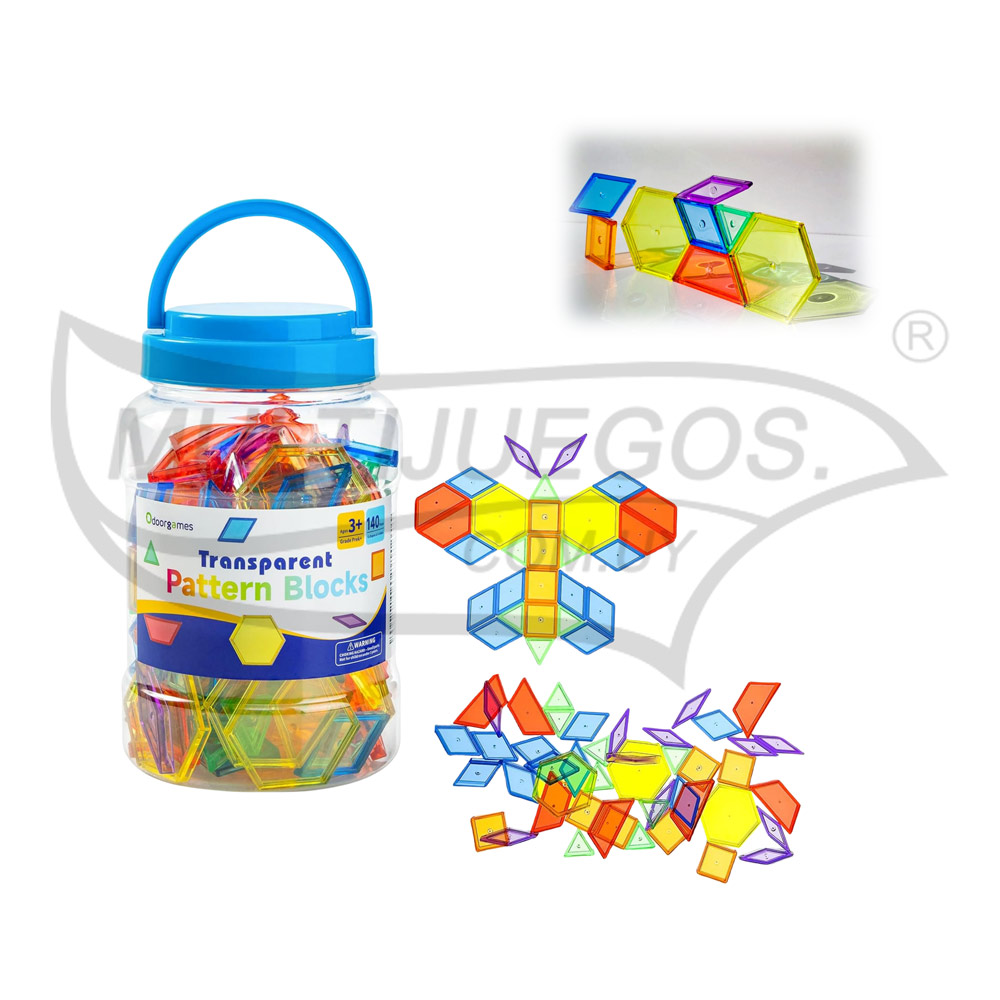 Cantidad de piezas: 140 piezas / Medidas piezas más grandes: 5 cm / Medidas piezas más pequeña: 2.5 cm / Material: plástico / Embalaje: tarro /Características: octágono 5 cm, triangulo verde 2.5 cm, rombo azul 4 cm, cuadrado naranja 2.5 cm, trapecio 5 cm, rombo chico 4 cm