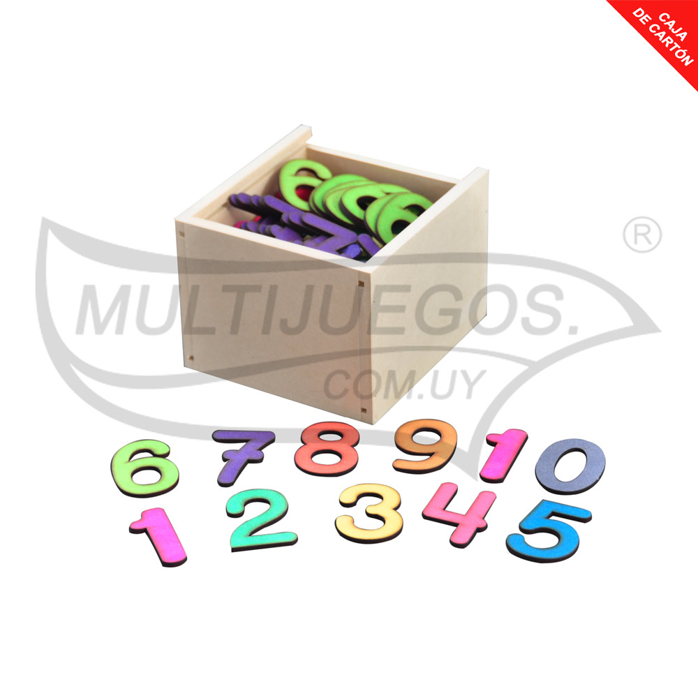 del 0 al 9 en colores / Cantidad de piezas: / Material: / Medidas de las piezas: / Dimensión de la caja: / Embalaje: caja de MDF / Características: