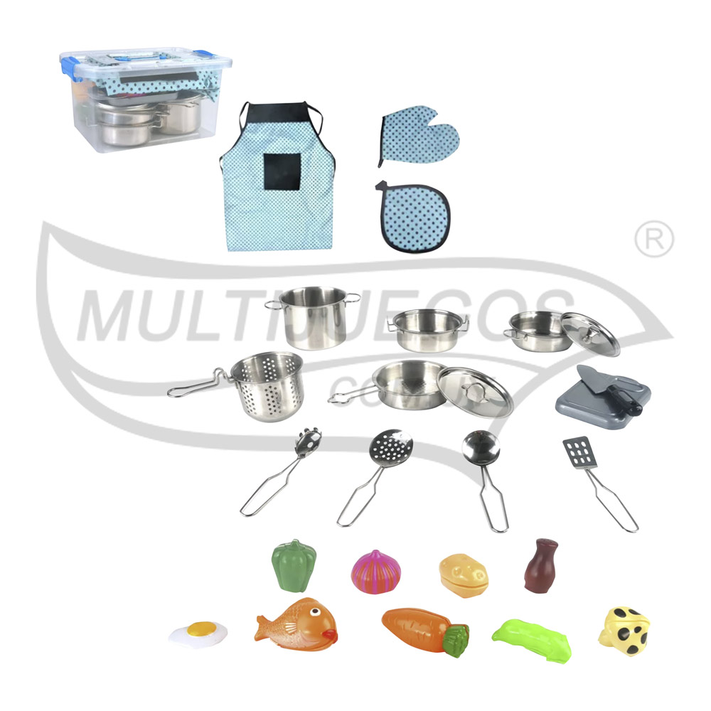 Material: metal, plástico y tela / Cantidad de piezas: 28 / Medidas de la pieza más grande: 14 x 9 x 7 cm (olla) / Incluye: delantal, manopla, vegetales al medio con velcro / Embalaje: caja plático de 25 x 19 x 13 cm