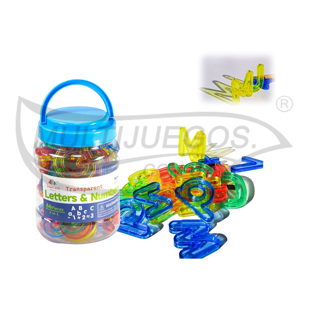 Cantidad de piezas: 66 aprox. / Medidas de la pieza más grande: 5 cm / Material: Plástico / Embalaje: Tarro / Dimensión del embalaje: 14,5 x 9,5 cm / Características: 26 mayúsculas 5 cm alto, 26 minúsculas 3.5 cm alto, 11 números 5.5 cm y 3 signos
