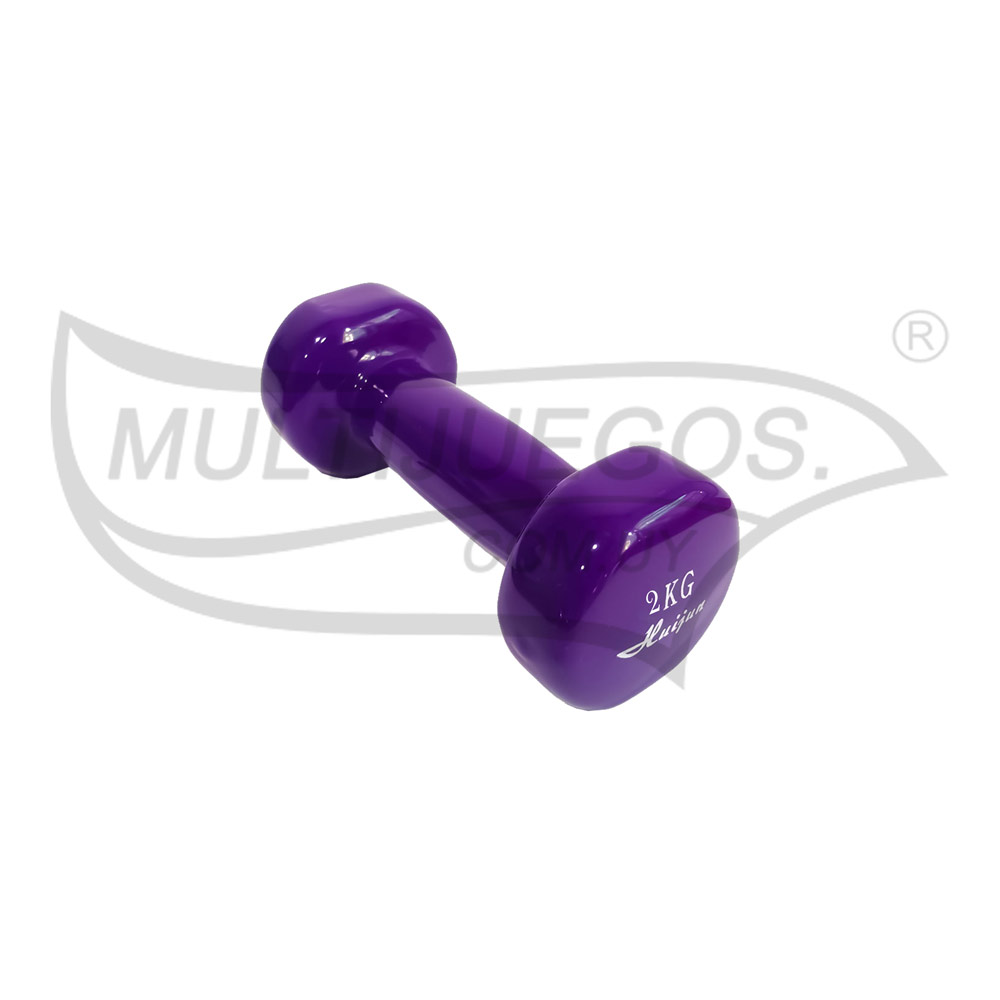 Cantidad de piezas: 1 / Medidas: 2 Kg / Material: Hierro Forradas en PVC / Embalaje: / Dimensión del embalaje: / Características: Su forma evita que ruede por el suelo. El revestimiento de PVC disminuye el ruido durante el impacto para mayor confort