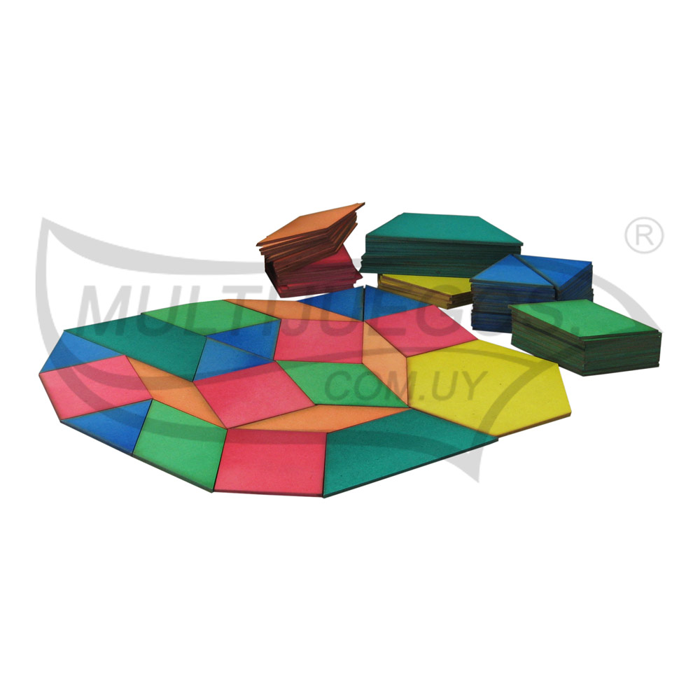 Las medias de los lados de las piezas se corresponden entre sí. Es decir que, por ejemplo, los del rombo miden los mismo que los lados del cuadrado. De esta forma las figuras que se forman son de un acabado perfecto.