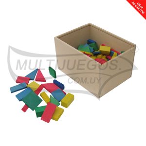 Cantidad de piezas: 45 / Material: madera (MDF) en colores / Medidas: 12 cm de lado / Dimensión de la caja: / Embalaje: caja de MDF / Características: