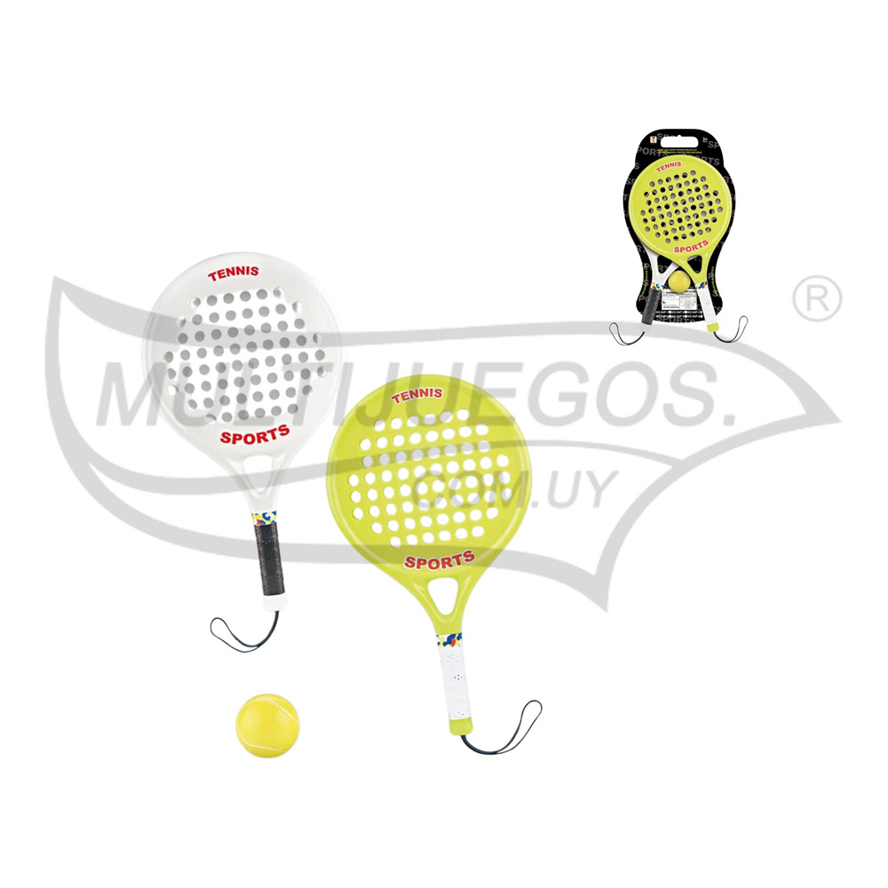 Cantidad de piezas: 3 / Medidas piezas más grandes: 39 x 22 x 3 cm / Medidas piezas más pequeña: 6 x 6 x 6 cm / Material: plástico y goma / Embalaje: caja / medidas del embalaje: 23 x 15 x 1 cm / Caracteristicas: paletas de tenis para fomentar el deporte.
