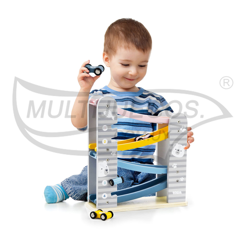 Material: Madera / Cantidad de piezas: 5 / Contiene una pista para lanzar con 4 autos