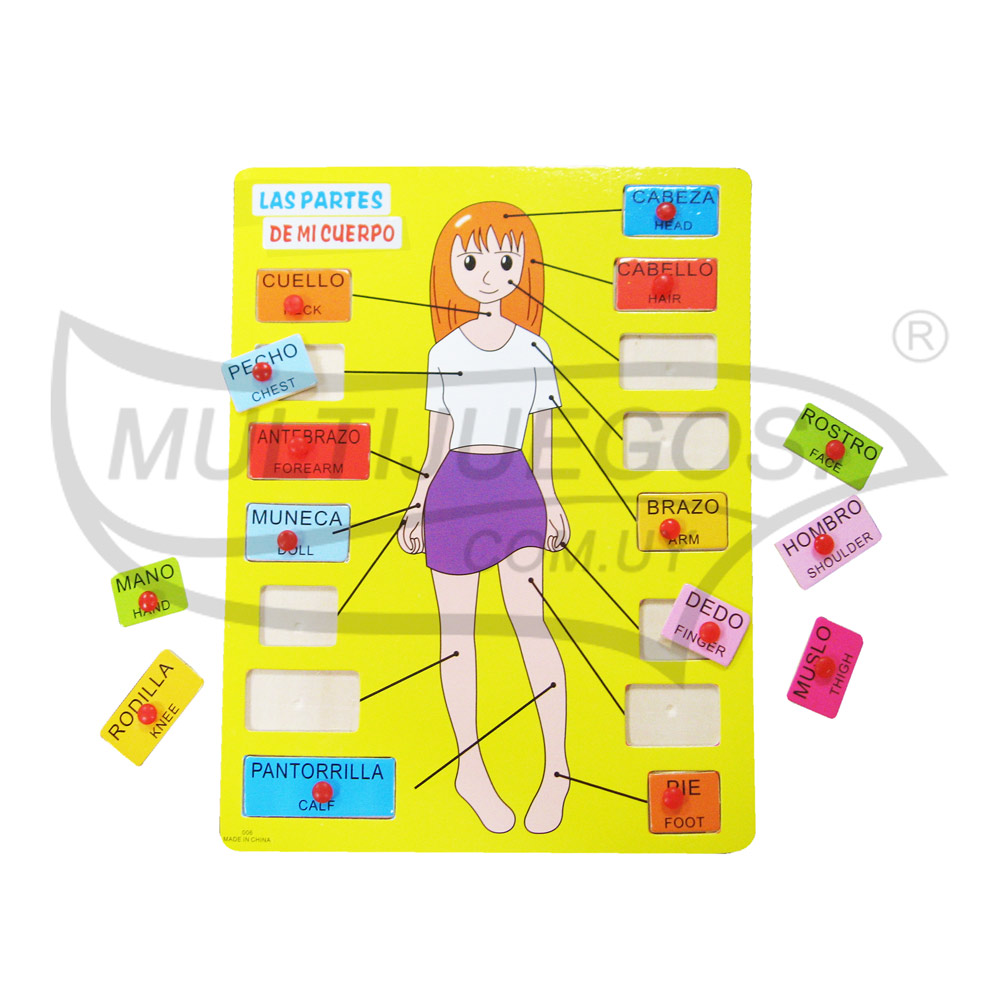 Cantidad de piezas: 16 / Material: Madera y plástico / Medidas: 30 x 22 x 0.5 cm / Detalle: partes del cuerpo en español e ingles.