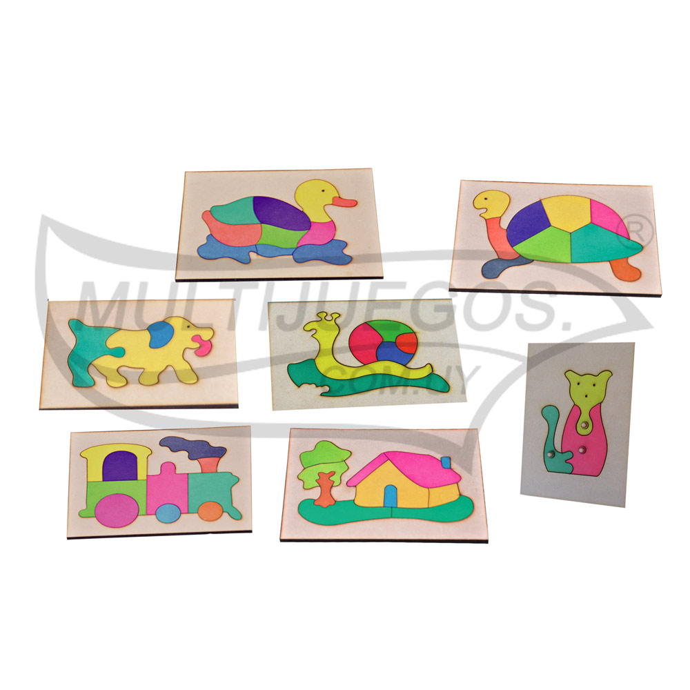 Contiene un solo rompecabeza / Precio por unidad / Hay 12 modelos diferentes con vástago / Cantidad de piezas: 1 a 4 c/u / Material: madera (MDF) en natural y colores/ Medidas: 19 x 26 x 0,6 cm / Dimensión de la caja: / Embalaje: en bolsa / Características: