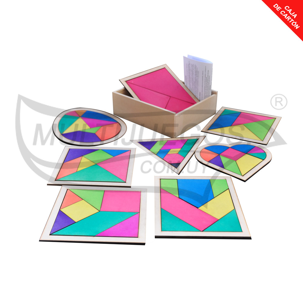 Es un juego chino antiquísimo que consiste en formar figuras utilizando siete piezas geométricas sin que estas se solapen. Con el tiempo se diseñaron muchas variables de colores, tamaños y materiales. Este set incluye 8 modelos diferentes de tangram que varían en forma y en grado de dificultad.